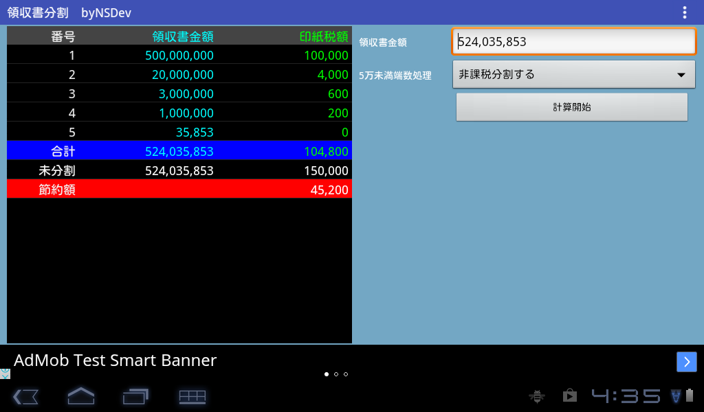 領収書の印紙税を少しでも少なくするために領収書をできる限り少ない枚数で効率よく分割するアプリです。
