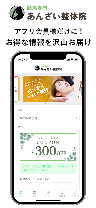 アプリを通して【頭痛専門 あんざい整体院】の新着情報やお得な情報を受け取ることができます。また、いつでもお手元のスマートフォンから、メニューやご希望のお時間帯のチェック・ご予約などが可能です。アプリをインストールしていただくことにより、【頭痛専門 あんざい整体院】をより便利に身近にご利用していただけます。
