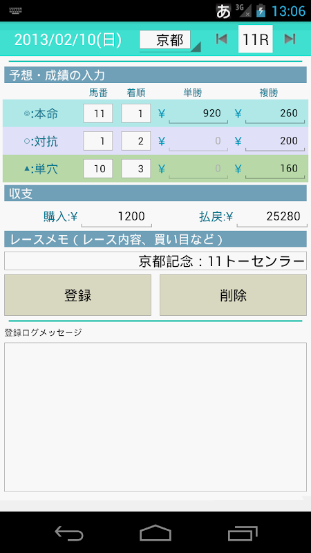 ・競馬場、レース番号は登録画面からでも変更可能です。