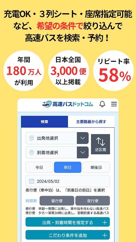 利用者年間180万人の予約サイト「高速バスドットコム」アプリ版!