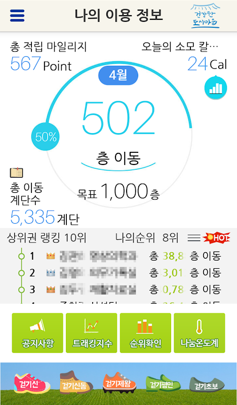 실시간으로 이용현황과 마일리지 적립, 나의 계단 이용 순위를 확인 할 수 있습니다.