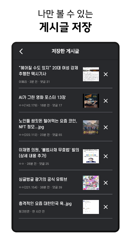 · 저장하고 싶은 게시글을 마음껏 저장할 수 있어요! 저장된 게시글은 저장할 당시 형태 그대로 보존 됩니다!