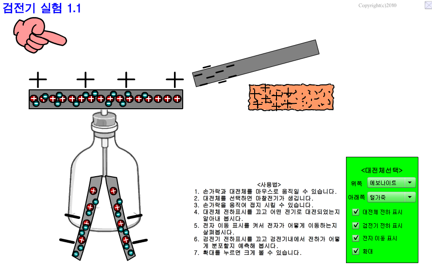 このプログラムを利用すれば、検電器を持って行うことができる次のような実験を仮想的にすべて確認することができます。