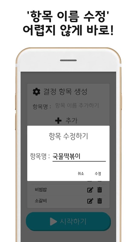 우선, 자신이 결정해야 할 요소들을 입력 합니다. 다음으로 결정과정을 시작하게 되면, 본 앱에서는 토너먼트 방식으로 결정요소들을 분류한 다음, 여러분들에게 각 결정항목들을 선택할 수 있는 스마트한 환경을 제공하고 있습니다.