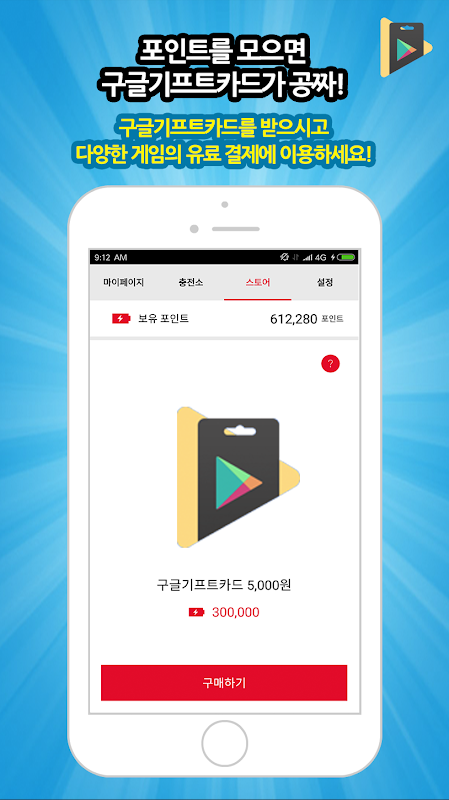 자동으로 포인트가 쌓이면 [스토어] 메뉴를 이용하여 플레이스토어에 등록된 각종 모바일 게임을 유료 결제하실 수 있답니다~ 물론 무료로^^
