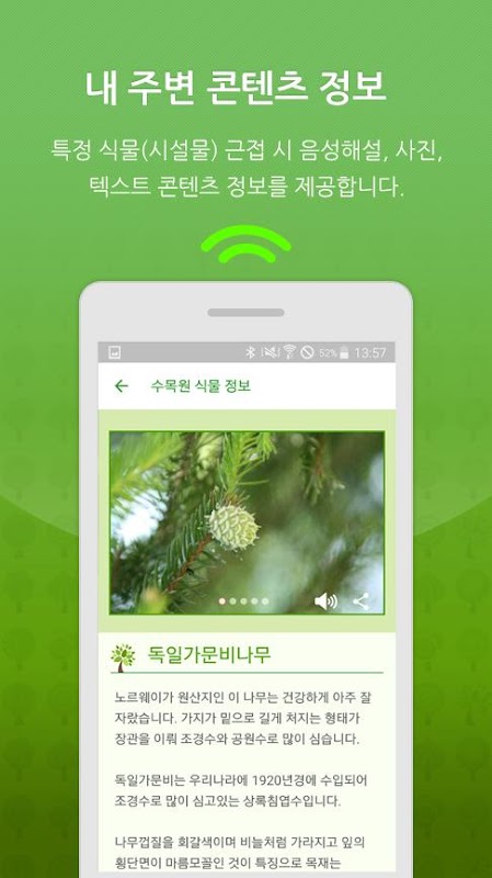 특정 식물(시설물) 근접 시 음성해설, 사진, 텍스트 콘텐츠 정보를 제공합니다.