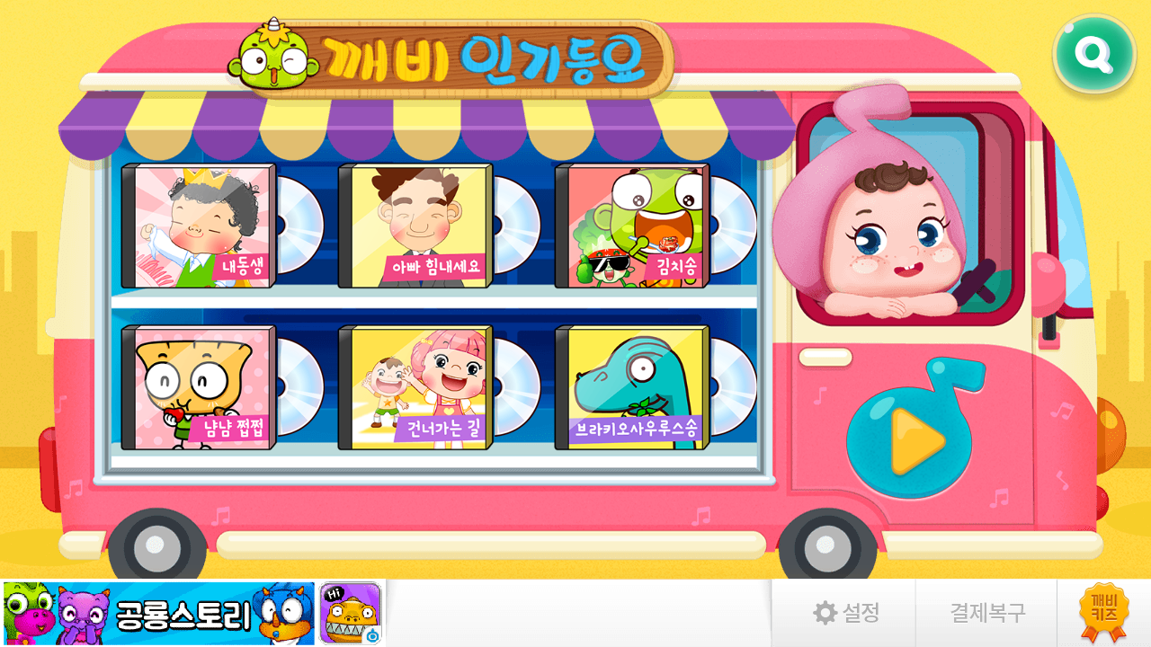 주제별로 묶인 동요들의 무료 곡들을 들어보시고, 아이가 마음에 들어한다면 구매하세요.