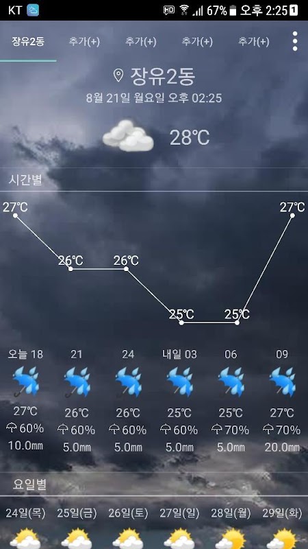 날씨앱을 사용하면 오늘날씨만 알 수 있는것이 아니라 일주일간의 일기 예보도 볼 수 있습니다.