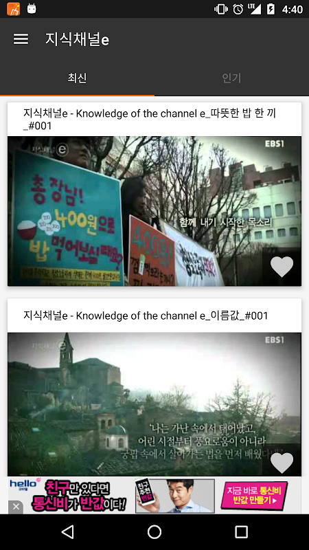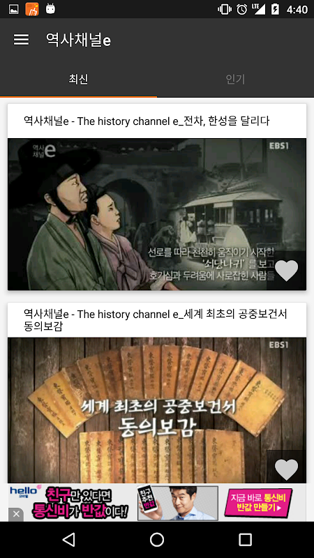 지식채널e, 역사채널e 영상을 인기순, 최신순으로 확인할 수 있습니다.