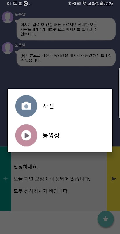 이제 메시지, 사진, 동영상을 입력하고 친구를 선택하시면 1:1 대화창으로 모두에게 메시지를 전송할 수 있습니다.