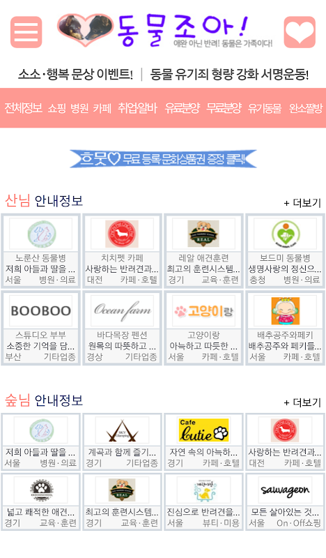 동물조아-반려동물(애완동물x)·실종·유기동물 보호·분양·입양 동물병원·카페·미용·호텔 홍보