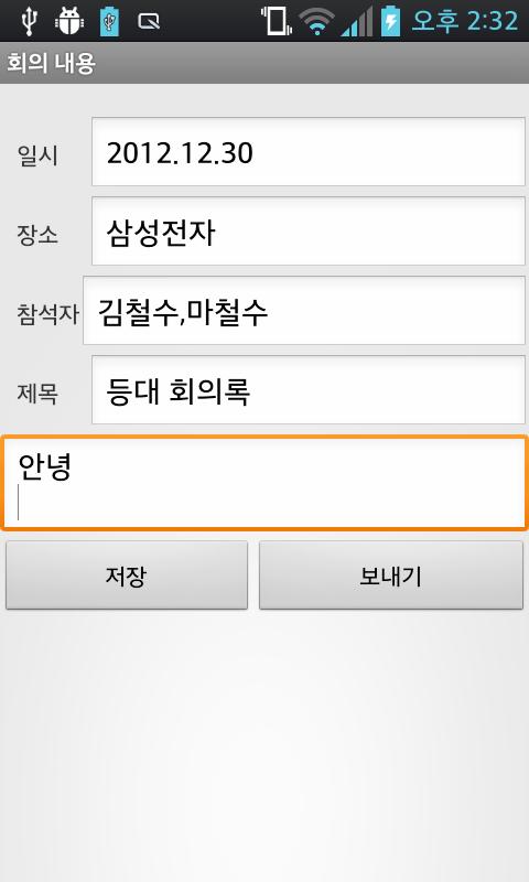 일시, 장소, 참석자, 제목, 내용을 기재 할 수 있습니다.