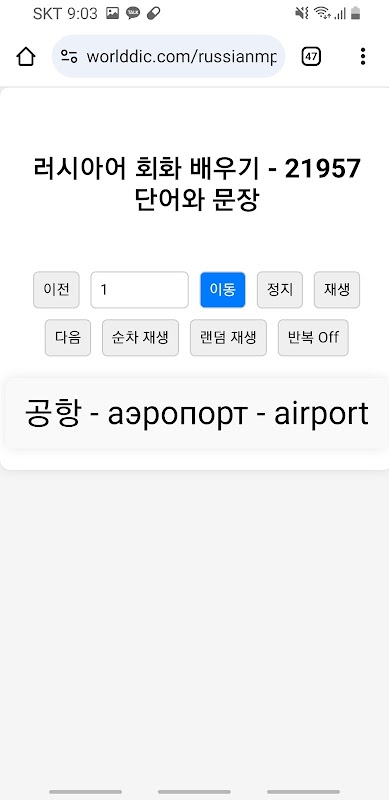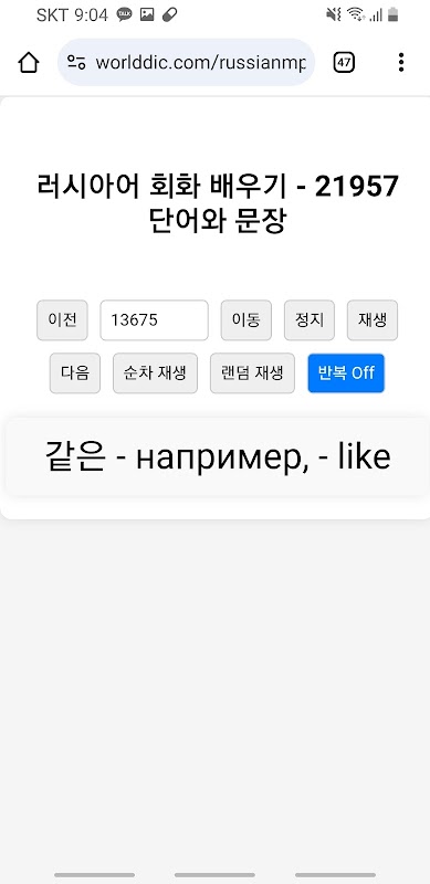 暗記と話す訓練のために韓国語とロシア語(韓国語1番、ロシア語3番、韓国語1番ロシア語2番、韓国語1番、ロシア語1番-100個の文章が結ばれている)の6千以上の文章と1万5千個の単語の音声録音mp3ファイルがある。