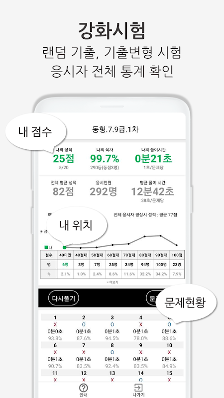 - 하루 랜덤으로 소량의 문제를 풀며 취약 부분을 확인하고 하단 버튼으로 보완할 수 있습니다.