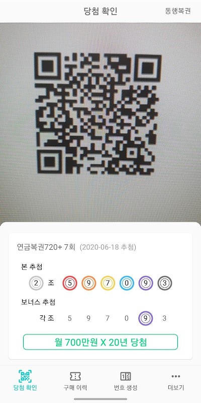 ロト6/45当選確認、年金宝くじ720+当選確認(QRコードを認識し、同行宝くじ連動)、宝くじの購入履歴機能、宝くじの当選番号の生成機能、通知機能を提供