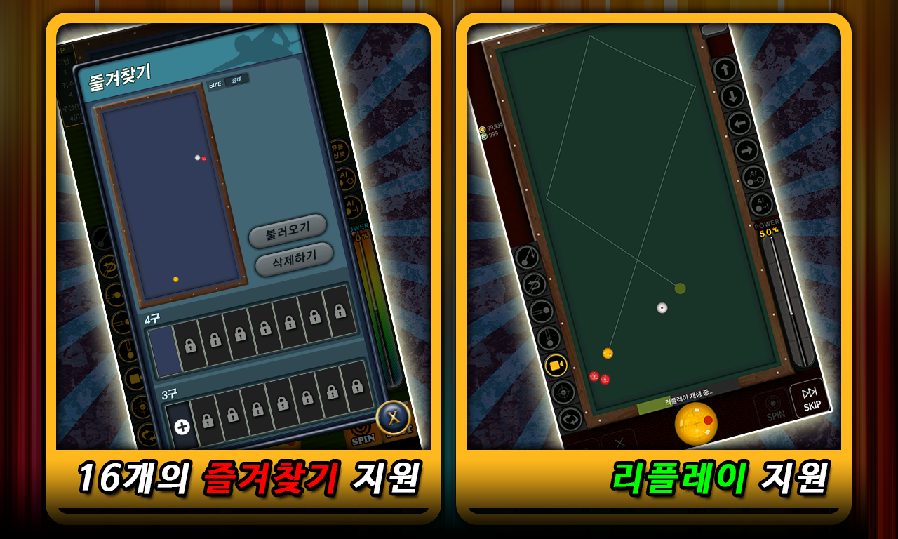 - バトルモードでは、数多くのコリアンダー、準プロ、プロ選手たちと一緒にシックスボール、3クッション(大隊)ゲームを無限対戦形式で楽しむことができ、獲得したアイテムにキュデをアップグレードみてください!
