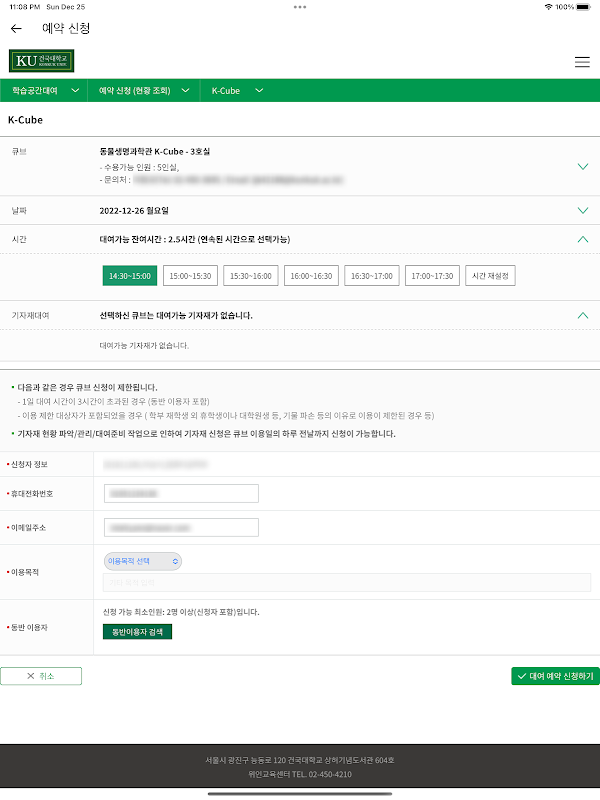 You can easily reserve Konkuk University K-Cube/Hub facilities.