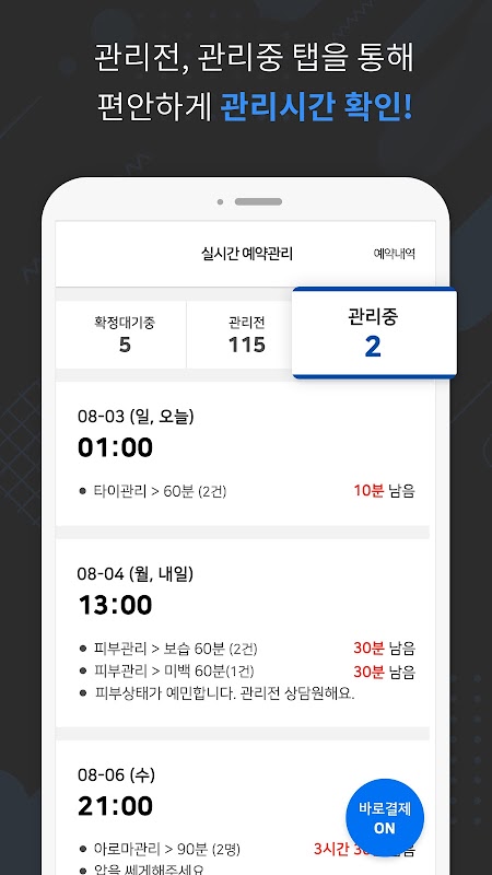 - 確定待機中、管理前、管理の3つのステップでお客様の予約をチェックできるように提供します。
