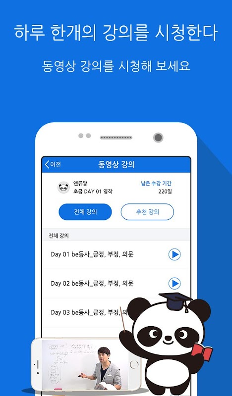 1:1 맞춤형 영어회화 개인과외를 언제 어디서나 1년 365일 이용해보세요. 지금까지 안 되던 영어가 입 밖으로 술술 나오는 변화를 체험할 수 있습니다. 스타강사 앤드류의 강의를 모바일로 시청하고, 영어판다앱을 이용해 배운 것들을 복습하고, Google음성인식 기능을 사용해 말하기 연습을 하면 사용자의 발음, 억양, 표현 등을 정확하게 인식해 즉각적은 피드백을 전달함으로써 효과적으로 말하기 실력을 향상시킬 수 있습니다.