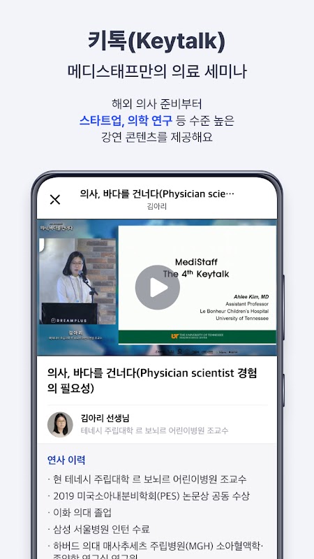 :認定された資格に基づいて各分野の専門医療知識を分かち合い、同様の関心事を共有し、医師として生きていく話をする空間です。