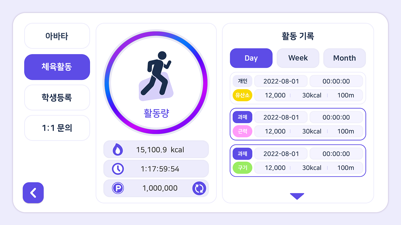 学生はアプリが提供する有酸素運動測定器を利用して有酸素運動記録を測定し、人工知能ベースのAI運動コーチに筋力運動5種を学ぶこともできます。体育活動の結果はゲームマネーに換算され、学生のアバターをアップグレードできるようにします。教師は学習センターメニューを介して学生の体育活動を指示し、学生の達成結果を監視することができます。