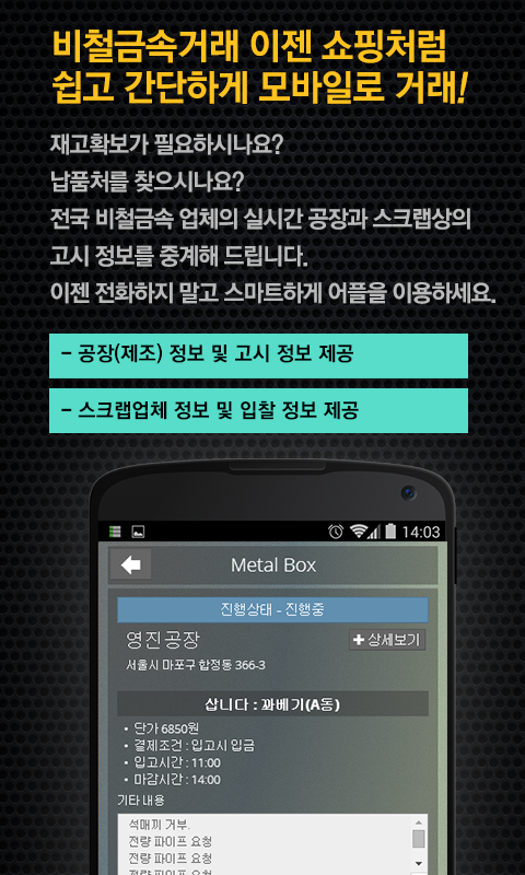 키워드: 메탈박스, metal box, 업체 관리, 비철금속, 거래 어플, 역경매 어플, LME, LME 시세, 실시간 시세, 스크랩상 거래, 공장 거래, 비철금속, 삽니다. 팝니다. 환율 시세, 상해 시세, 상해 LME, 동 시세, cu 시세, copper 시세, 조달청, 고시 가격, 오늘의 환율, 꽈배기, A동, 차핑, 챠핑, 캔디, 상동, 파동, 입찰, push 알람, push 메세지, push, 투자, 거래, 중계, 경매, 고철, 고물상, 스크랩상, 금속, 구리