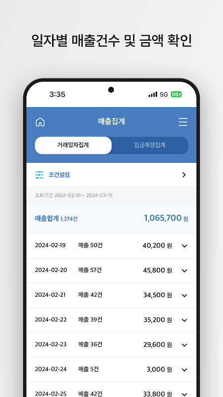 韓国情報通信イージーチェック無人機器加盟店でカード、現金売上内訳を確認し、買取入金予定内訳を照会してみることができるモバイルサービスです。