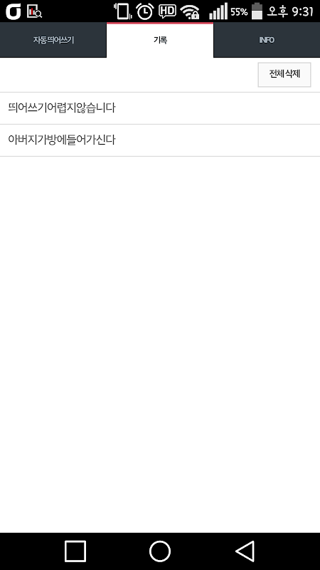自動的にハングル分かち書きを実行した結果を提供するアプリ。 自動スペル修正機能を追加。