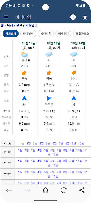 2. 時間別天気 - 水の出を提供する地域の天気情報を3時間単位でサービスしており、その地域の掘り出し、破向、波周期などを一緒にサービスしてサーフィンなど海洋レジャーのためのサービスを含んでいます。