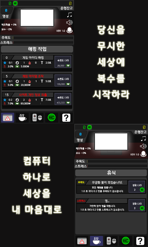 블랙 해커가 된 당신은 해킹 작업을 하며 은행 잔고를 채워나갑니다.