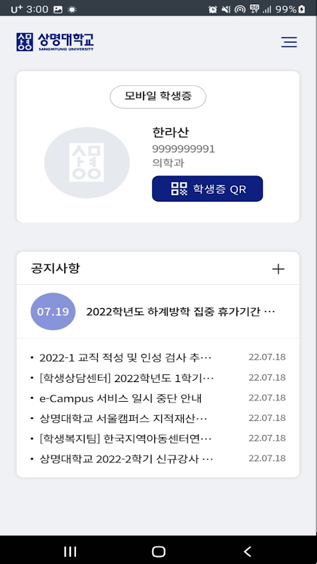 サンミョン大学のメンバーのモバイルIDでアプリを活用して、校内や関連機関で学生証(またはID)として活用できます。