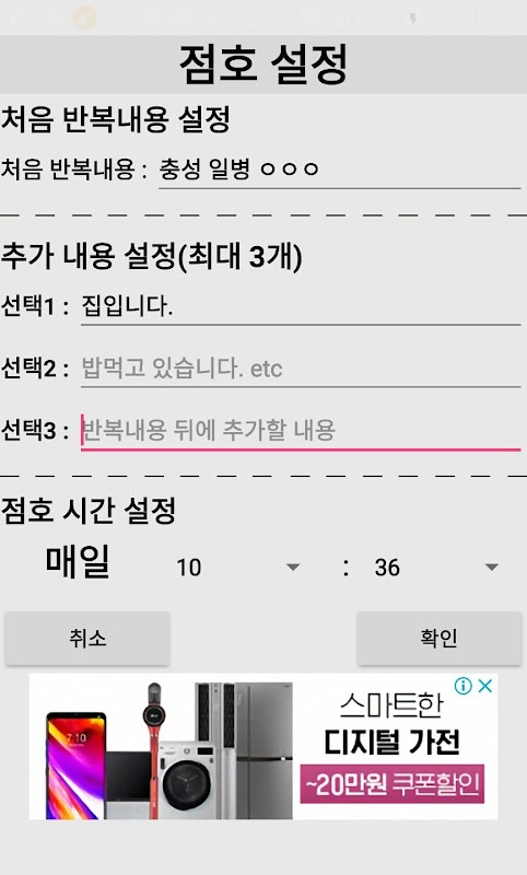 - 점호 시간에 내용 설정 -> 미리 설정된 최대 3개중 랜덤으로 바로 세팅(카톡방만 선택)