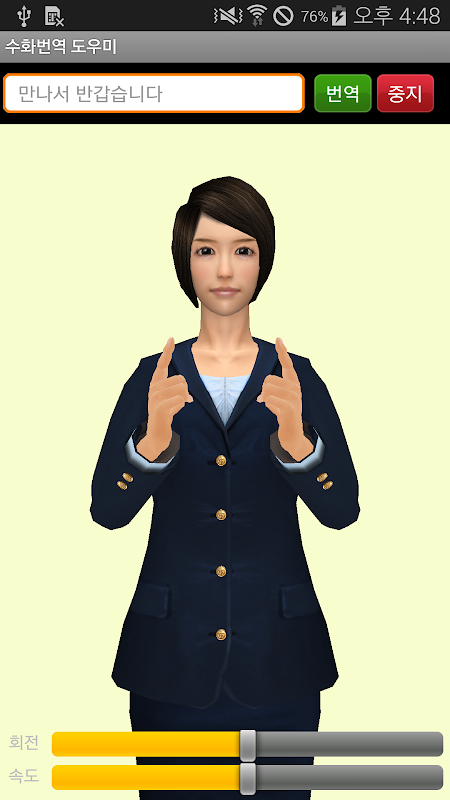 - 手話キャラクターがアニメーションされている途中で、画面のタッチを通じた一時停止と再生機能