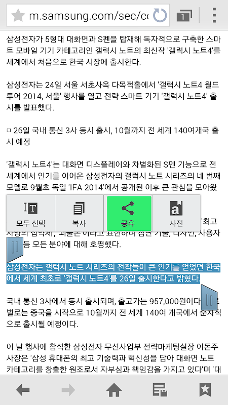 - インターネットや他のアプリ使用中の文字領域の選択を通じた「共有」を通じたアプリ実行可能