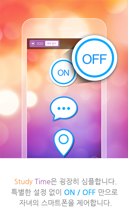 스터디타임은 세상에서 가장 사용하기 쉬운 청소년 스마트폰 중독 방지를 위한 앱입니다. ON/OFF하나의 버튼으로 자녀의 스마트폰의 사용을 제어해보세요.