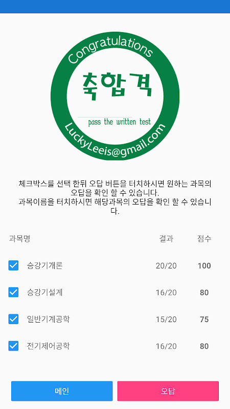 성적확인 - 각 과목별 성적 및 그동안 풀어본 기출문제와 모의고사, 문제풀기의 성적을 볼 수 있습니다.