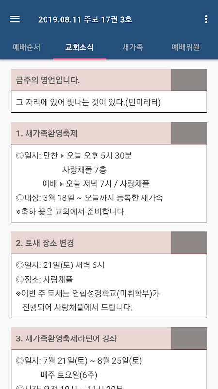 安城中央教会の聖徒たちが紙週報の代わりにスマートフォンで毎週週報を見ることができる100%ネイティブアプリ(アプリ)スマート週報です。