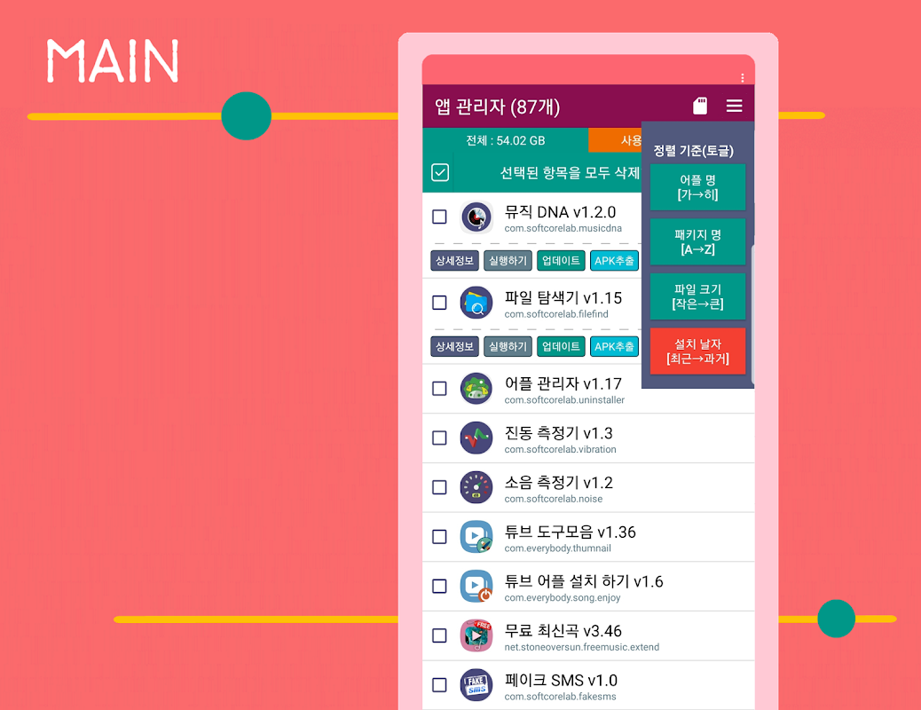 - 앱 최신설치순 용량순 이름순등으로 소팅 지원