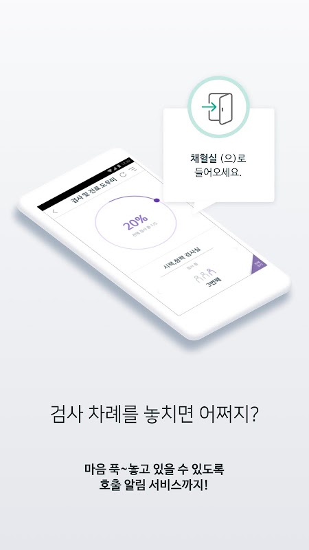 - 검사실 입장 알림: 첫 번째 대기순서일 때 알림을 드려요. 다른 곳에서 편하게 기다리다가 알림을 받으면 검사실 앞으로 오시면 됩니다.