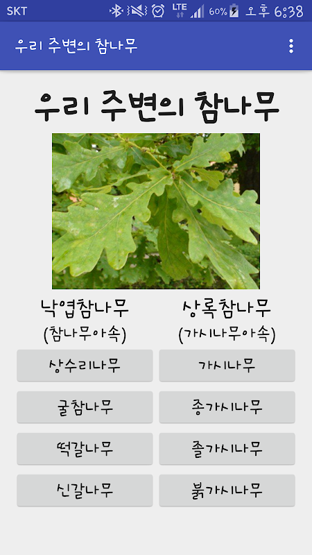私たちの周りでよく見ることができる私たちの国に自生する温帯落葉オークと暖帯常緑オークの種類と特徴を調べてみるアプリです。