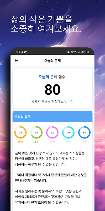 毎日新しい今日の占い 総運、愛情運、富み運、職場運、学業/試験運、健康運の様々な分野で確認でき、カスタマイズされた占いを受けてご覧いただけます。