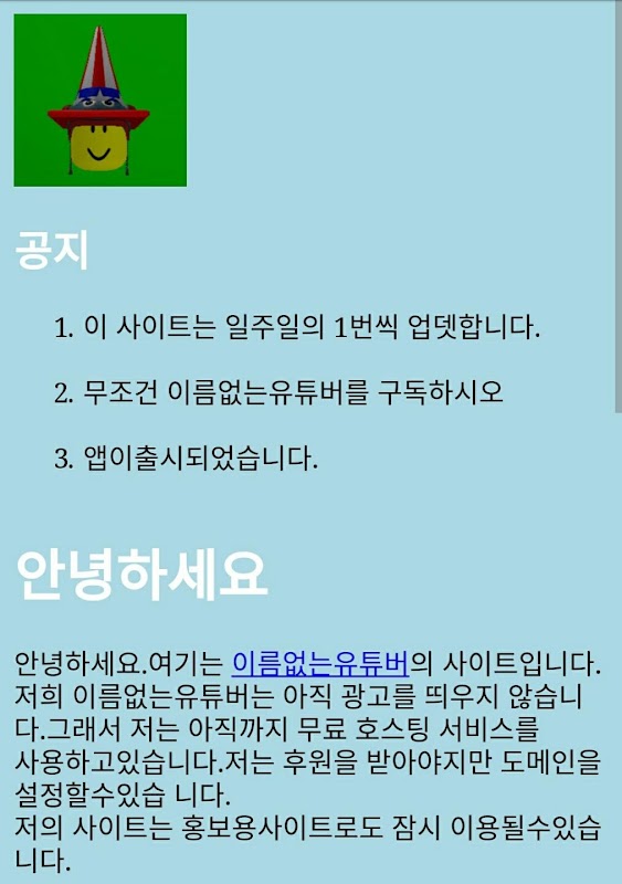 안녕하세요.이 앱은 이름없는유튜버의 사이트로 접속되는앱입니다.