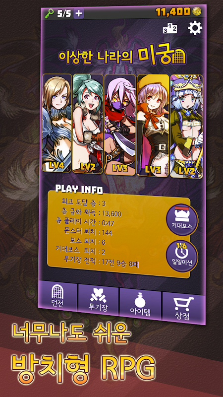 1. 던전탐험 : 몇 층인지도 모르는 끝없는 던전을 탐험하면서 몬스터를 물리치고 금화와 아이템을 보상으로 얻습니다.