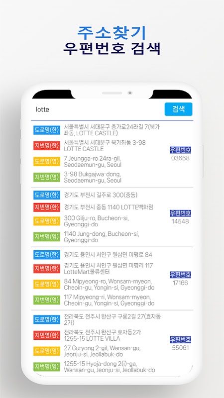 주소/우편번호 찾기 (도로명, 지번, 영문, 우편번호)
