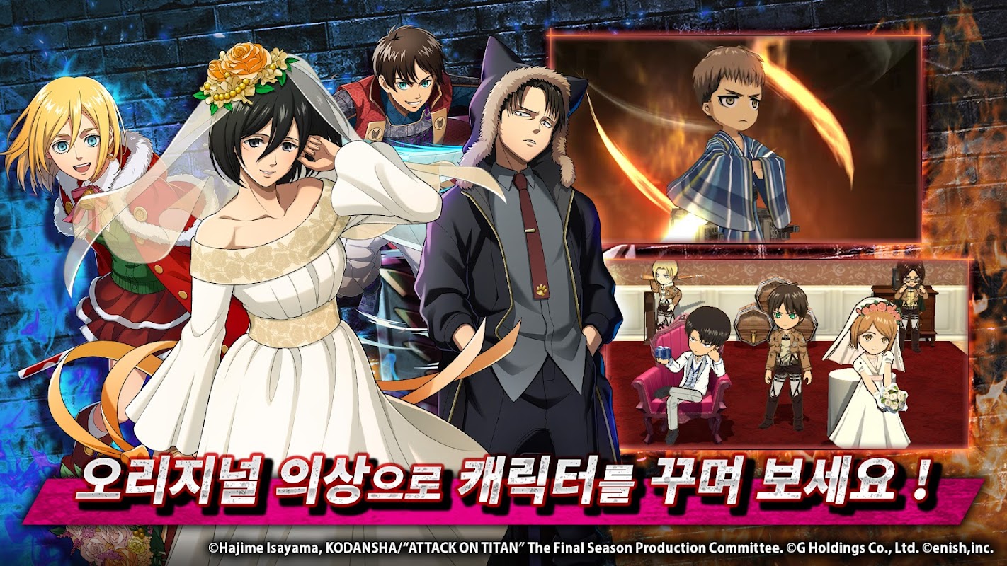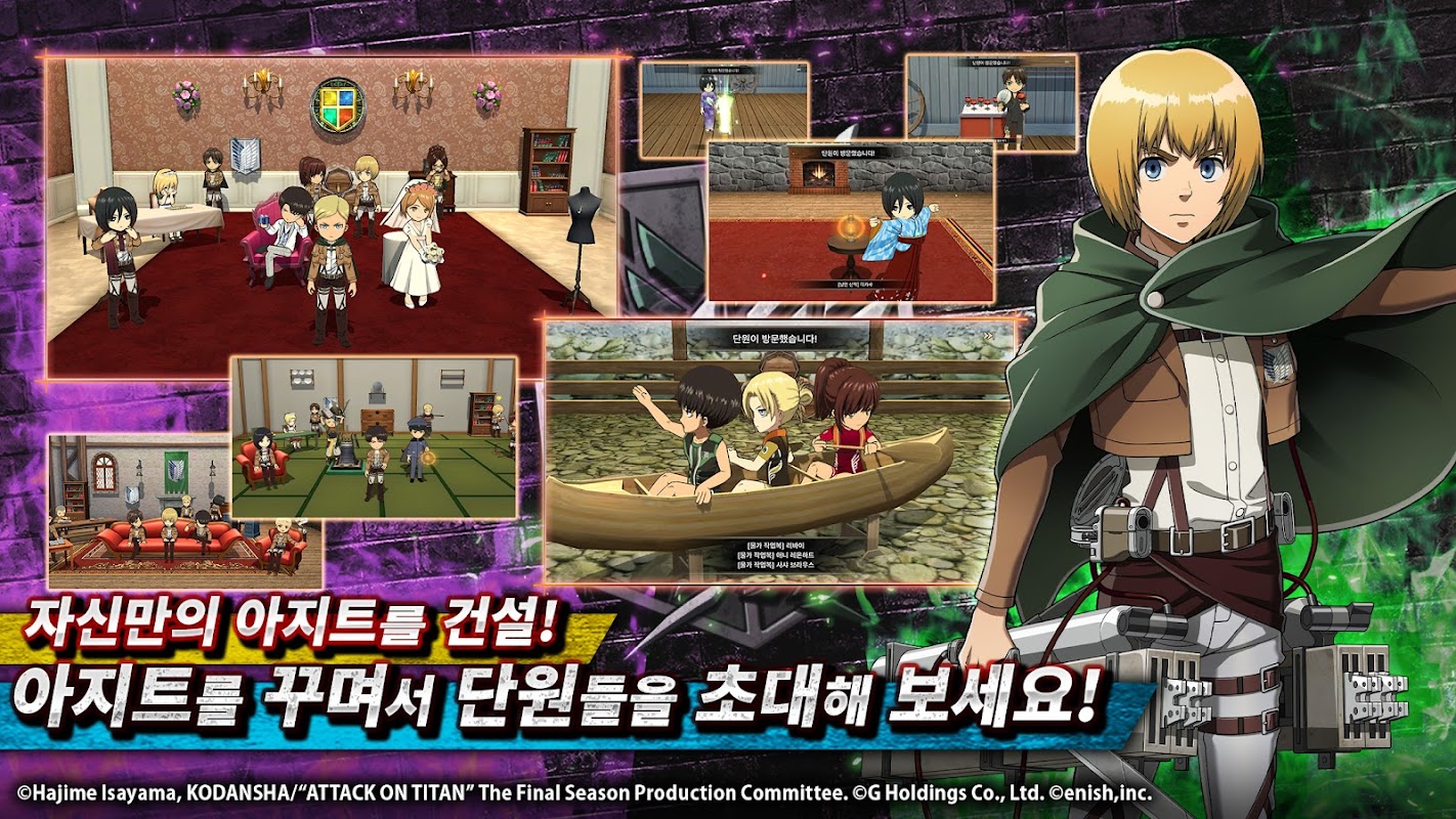 豪華声優陣のオリジナルフルボイスでストーリーを進行し、エレン、ミカサ、アルミン、リーバイ、ハンジ、エルビンなど人気キャラクターたちで自分だけの兵団を作ってアジトを飾ることもできます。