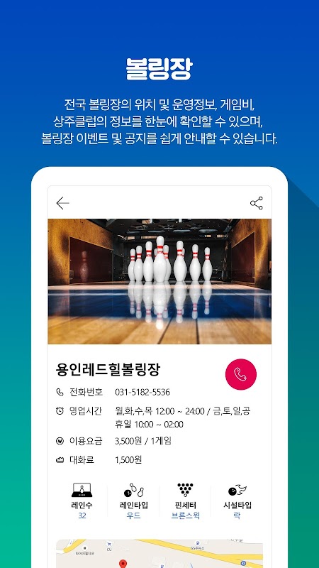 全国ボーリング場の位置及び運営情報、ゲーム費、常駐クラブの情報を一目で確認することができ、