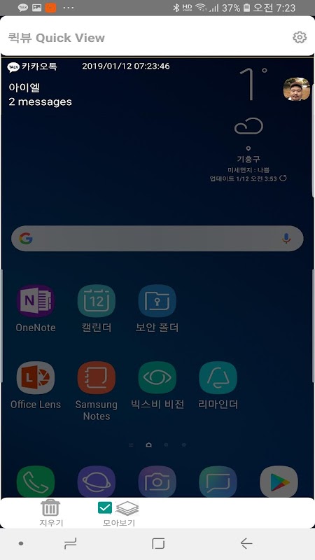퀵뷰는 대기화면에서 카톡과 페이스북 메신저 내용을 '1'이 사라지지 않고 미리보기 할 수 있습니다.