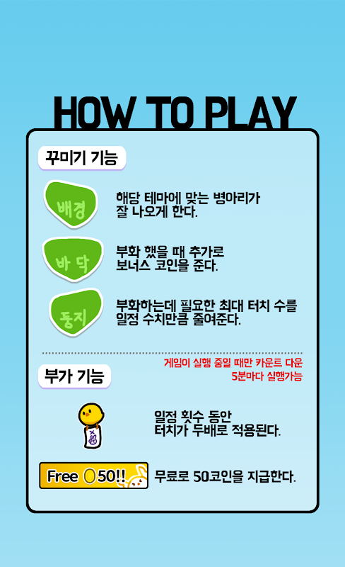 - 기본 조작은 원 터치! 알을 계속 터치하면 끝!!