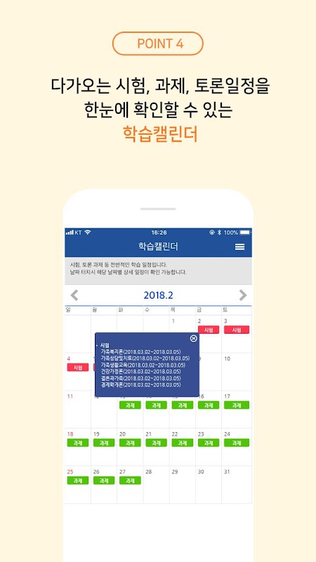 - 今後の試験、課題、議論のスケジュールなどを一目で確認できる学習カレンダー