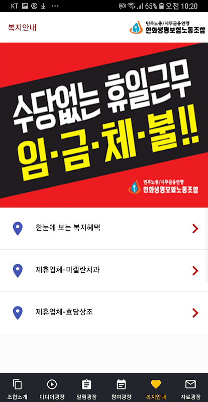조합소개, 미디어광장, 알림광장, 참여광장, 복지안내, 자료광장등의 메뉴로 되어있는 본격 노동조합 어플입니다.